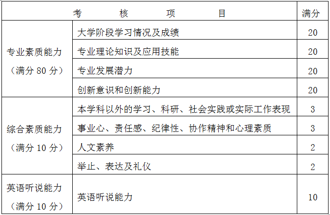 综合面试满分为100分,考核考生专业素质、综合素质以及英语听说能力,每生考核时间不少于20分钟, 其中专业素质和综合素质占90分,英语听说能力占10分。考生专业素质和综合素质的考核内容如下: