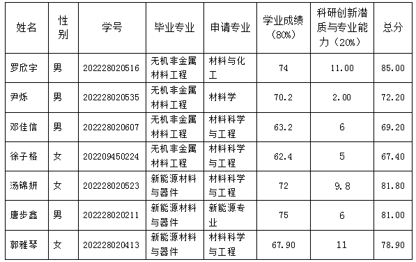 根据《长沙理工大学推荐优秀应届本科毕业生免试攻读硕士学位研究生实施办法》(长理工大教〔2024〕26号)和《材料科学与工程学院2026年推荐优秀应届本科毕业生免试攻读研究生工作细则》、《材料科学与工程学院2026年推荐优秀应届本科毕业生免试攻读研究生工作方案》文件精神,经过对申请同学材料的审核,2026年拟推荐免试攻读硕士学位研究生名单如下: