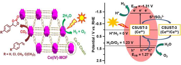 CSUST-3:目前报道的40多例Ce(IV)-MOFs中,绝大多数都是基于Ce簇的UiO-66结构。单晶结构分析表明,CSUST-3是基于Ce-O链的Ce(IV)-MOF。采用溶剂交换热活化策略对其进行活化,暴露Ce(IV)开放位点后,CSUST-3能在温和的条件下,通过催化氧化羧化苯乙烯类化合物,高效固定CO2。与此同时,其也能在不使用贵金属作为共催化剂的条件下,光解水产氢产氧。该工作同样以长沙理工大学为第一署名单位,以“A Novel Cerium(IV)-Based MOF for CO2 Chemical Fixation and Photocatalytic Overall Water Splitting”为题,发表在ChemSusChem(IF = 8.928)上。硕士研究生谷嘉欣为第一作者,金红广博士为唯一通讯作者。