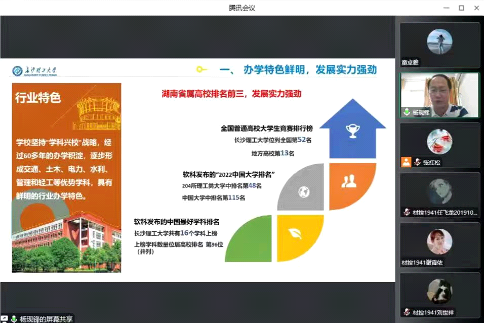 2022年9月23日上午9点30分,杨现锋副院长应河南工程学院机械工程学院邀请,为该院材料成型与控制等专业开展了专场研究生招生线上宣讲。河南工程学院机械工程学院院长张红松教授和50余名学生参加了宣讲会。杨现锋副院长就2023年材料学院招生基本情况进行了详细说明,详细回答了同学们的咨询,欢迎同学们报考长沙理工大学材料学院。