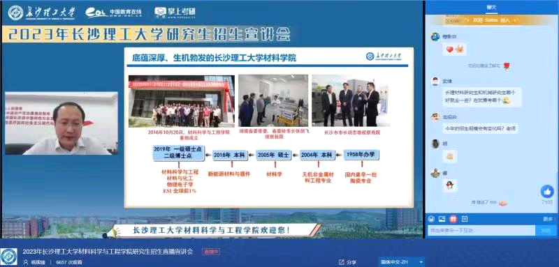 杨现锋副院长首先介绍长沙理工大学和材料学院的基本情况,向各位考生展现了深厚底蕴、生机勃发的长沙理工大学材料学院,随后介绍了雷竞技官网材料学院的四大研究方向、潜心问道的研究生导师队伍以及一流的科研平台与条件,展现了长沙理工大学优美的生活环境和良好的学习氛围,诚邀考生报考长沙理工大学材料科学与工程学院。