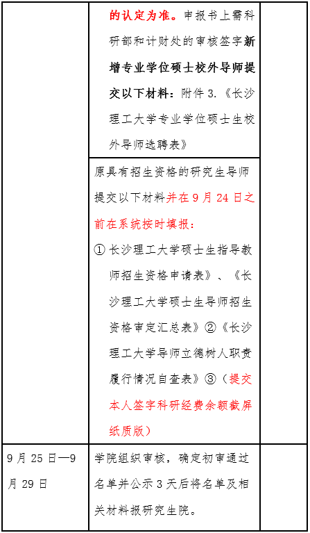 3.依据《长沙理工大学落实研究生导师立德树人职责实施细则(试行)》规定,对导师立德树人职责履行情况进行审核。往年担任导师的校内申请者均需填写导师立德树人职责履行情况自查表,交学院审核。自查表中所列“七项职责”单项打分有3分以下者,学院将重点审核,有出现“十类失范行为”之一者,取消导师申报资格。