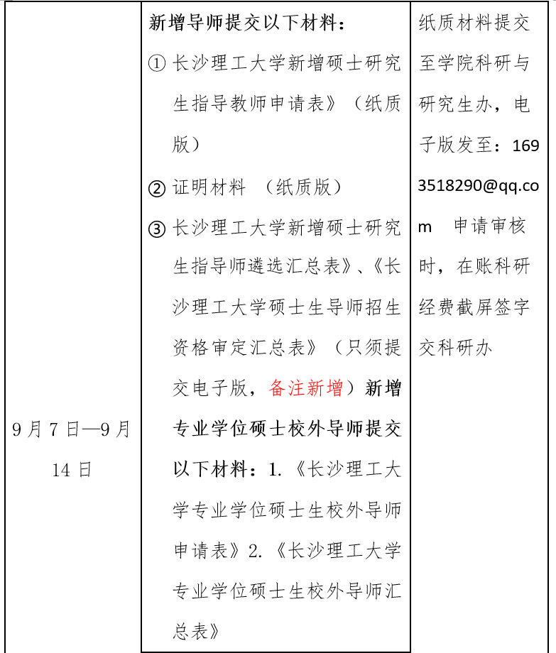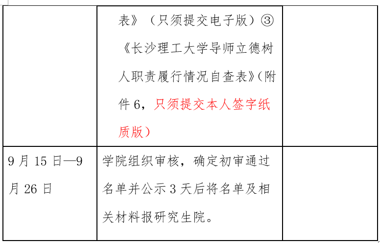 3.依据《长沙理工大学落实研究生导师立德树人职责实施细则(试行)》规定,对导师立德树人职责履行情况进行审核。往年担任导师的校内申请者均需填写导师立德树人职责履行情况自查表,交学院审核。自查表中所列“七项职责”单项打分有3分以下者,学院将重点审核,有出现“十类失范行为”之一者,取消导师申报资格。