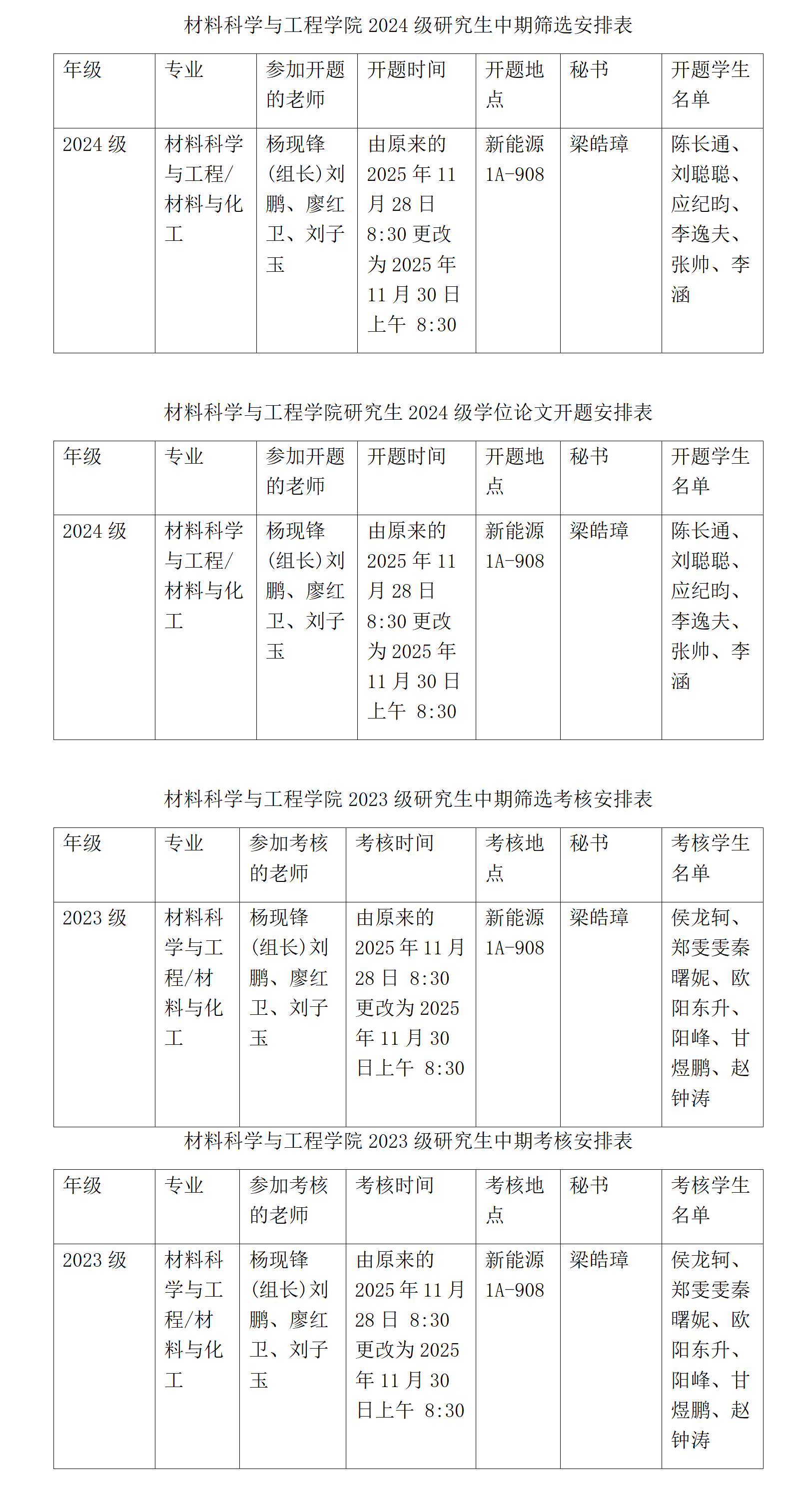 材料科学与工程学院2025年度研究生开题、中期筛选和中期检查安排表(四)