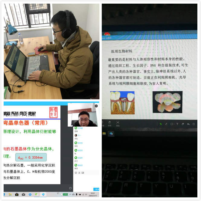 科研办结合省学位办《关于做好疫情防控期间研究生教学及有关工作的通知》、长沙理工大学《关于新型冠状病毒感染的肺炎疫情防控期间做好教学、科研等有关工作的通知》等文件精神,第一时间发布了《材料科学与工程学院防控新型冠状病毒肺炎期间研究生教学通知》,考虑到老师们在教学过程中要随时熟悉相关政策和文件精神,学院也收集了疫情防控以来国家、省、教育厅、学校、学院发布的各类文件和通知,并进行了整理汇编,形成了《材料科学与工程学院疫情防控期间研究生教学文件汇编》,让老师们学习执行。分管科研与研究生培养工作的副院长范金成以学生为中心,全面摸排,同时加强心理辅导,给予有困难学生和应届毕业生特别关注。分管教学的副院长陈曙光以他极高的专业素养及前瞻性,迅速做出反应,通知当天就建好《材料结构表征》腾讯课堂,19级同学在班长周润恺的带领下选好课并和陈老师积极沟通,通知当天建好课程微信群。周哲博士和徐协文老师紧接着也分别做好《新型炭材料》和《材料制备与加工技术》课程线上教学的相关工作,使得研究生线上课程教学工作顺利推进。