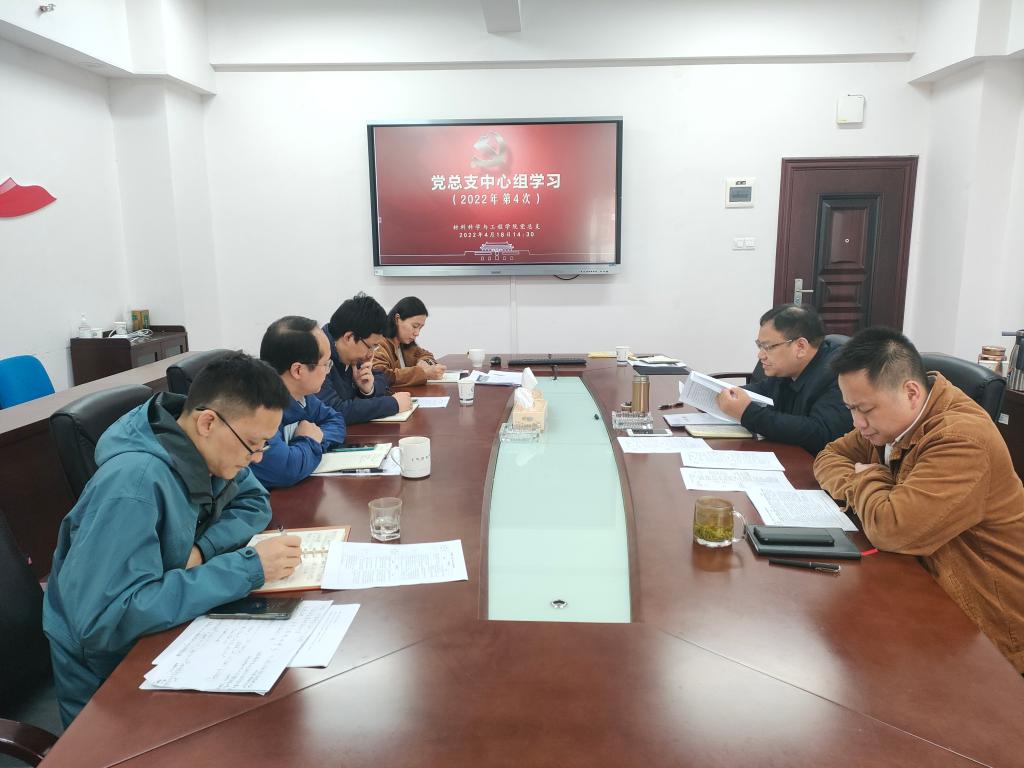 4月18日下午,材料学院党总支在新能源1号楼317会议室组织2022年第四次中心组学习。学习由院党总支书记唐超文主持,院党总支中心组全体成员参加。