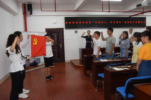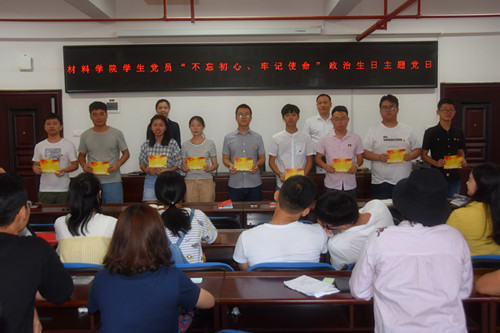 6月19日,材料学院“不忘初心、牢记使命”主题党日活动在新能源一号楼顺利进行,本次活动为全体学生党员过政治生日,并为选调生孙英羽送上了政治生日礼物,这也是学院毕业教育的活动之一。出席本次活动的有材料学院党总支书记张国强、副书记唐青、校招生就业处副处长贺良,全体学生党员参加了此次活动。