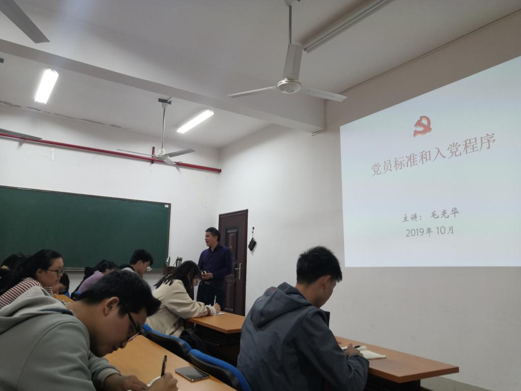开班典礼之后进行集中授课环节,首先由专职组织员毛光华以《党员标准和入党程序》为题授课,他分别从“为什么要入党?”“什么人可以入党?”“怎样才能入党?”这三个方面详细地向学员讲述了党员的标准以及入党程序。他强调学员必须树立正确的入党动机,不论在思想上还是生活中都必须以一名党员的标准要求自己,严格按照“四讲四有”的标准做到“四个合格”,充分发挥先锋模范作用。随后,材料学院党总支书记张国强讲授第二次党课-《重温党的奋斗历程,增强历史使命感》。他从人类工业文明进程以及两个具有深刻意义的思考题入手,引出了中国共产党的奋斗路程,接着以中国共产党探索救国救民之路、立制建国兴国之路、改革开放强国之路和“中国道路”巨大成功之解密四个部分,为入党积极分子们详细的介绍了党的历史和发展过程,并深入浅出的阐释了“中国道路”的巨大成功根源于中国共产党的坚强领导。最后,他对学员提出殷切的期望:希望每个入党积极分子都能加深对党的真情,创造优异条件,争取早日加入伟大的中国共产党!