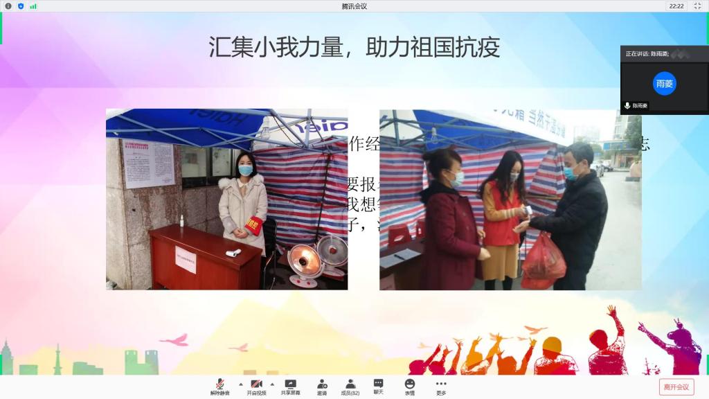 陈雨菱通过自己在疫情期间主动参与社区疫情防控志愿服务的经历讲述了防控一线工作人员的坚守,结合习近平总书记对青年的寄语与嘱托,更好的领会了青年的使命担当;欧镇滔谈及自己为湖北地区募捐物资的行为是初心使然,他说道:我们只有珍惜这个时代、担负时代使命,在担当中历练,在尽责中成长,才能让青春在新时代的广阔天地中绽放,让人生在实现中国梦的奋进追逐中体现价值;任新宇向同学们深度解读了文化自信,一个个白衣天使、科技人员、解放军将士、党员干部迎难而上,火神山、雷神山、方舱医院拔地而起,创造基建奇迹,全国人民把高度的纪律性和执行力演绎得坚决而彻底,宅家共同抗疫。这一同舟共济的团结精神,是中国精神的生动诠释,更是社会主义文化自信的生动展示;闫苏则从疫情中中国共产党的决策力、领导力中系统阐述了中国强大的制度优势:党中央领导抗击疫情的斗争,使全国人民面对重大疫情有了“主心骨”;基层党组织坚守岗位、守土尽责,形成抗击疫情的战斗堡垒,凸显在疫情大考下中国特色社会主义制度的显著优势、强大效能和磅礴力量。