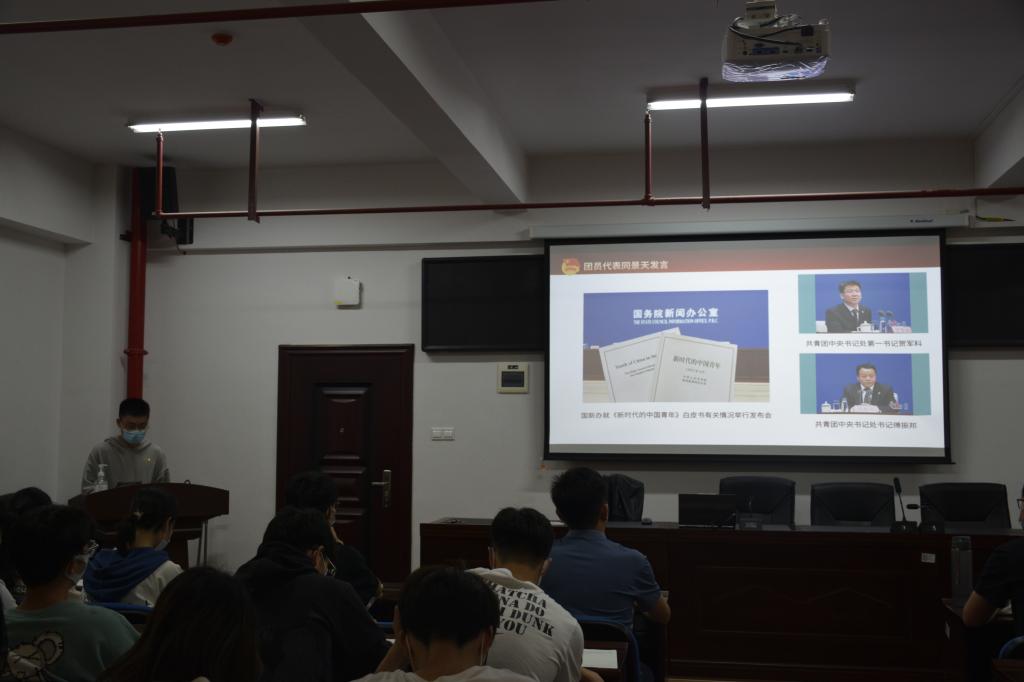 最后,团员代表金鑫、同景天分享了学习习近平总书记考察中国人民大学时的重要讲话精神。团员代表王巍锝、邵琪领学了《新时代的中国青年》白皮书。同学们纷纷表示,新时代党和政府为青年创造了良好的发展条件和成才机遇,习近平总书记对青年寄予厚望,作为一名大学生要坚定理想信念,扎实学好专业知识,勇担历史重任,用个人行动助力中华民族伟大复兴!