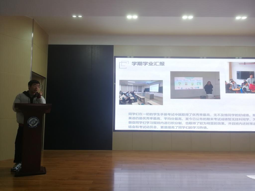 首先19级全体学生一起观看了《青春的模样》,感受榜样的力量,领会青春应有的风采。随后,六个新生班级代表依次进行学期工作汇报与成果展示,各位负责人通过PPT、视频、数据等方式分享了班级学风建设、文明养成、文化建设以及班级特色的建设举措和成效,并对下学期班级工作作展望,提出了量化的目标。1905班为提升班级凝聚力所开展的“每月暖心生日会”1904班为促学在学期末发起“相约图书馆”学习活动都给大家留下了深刻的印象。接着,银波对本学期年级工作进行总结,充分肯定了各班级取得的成绩,就存在的共性问题提出了相关建议。同时她宣读了在军训、文明寝室创建以及各项文体活动中获奖的优秀个人和团体名单。