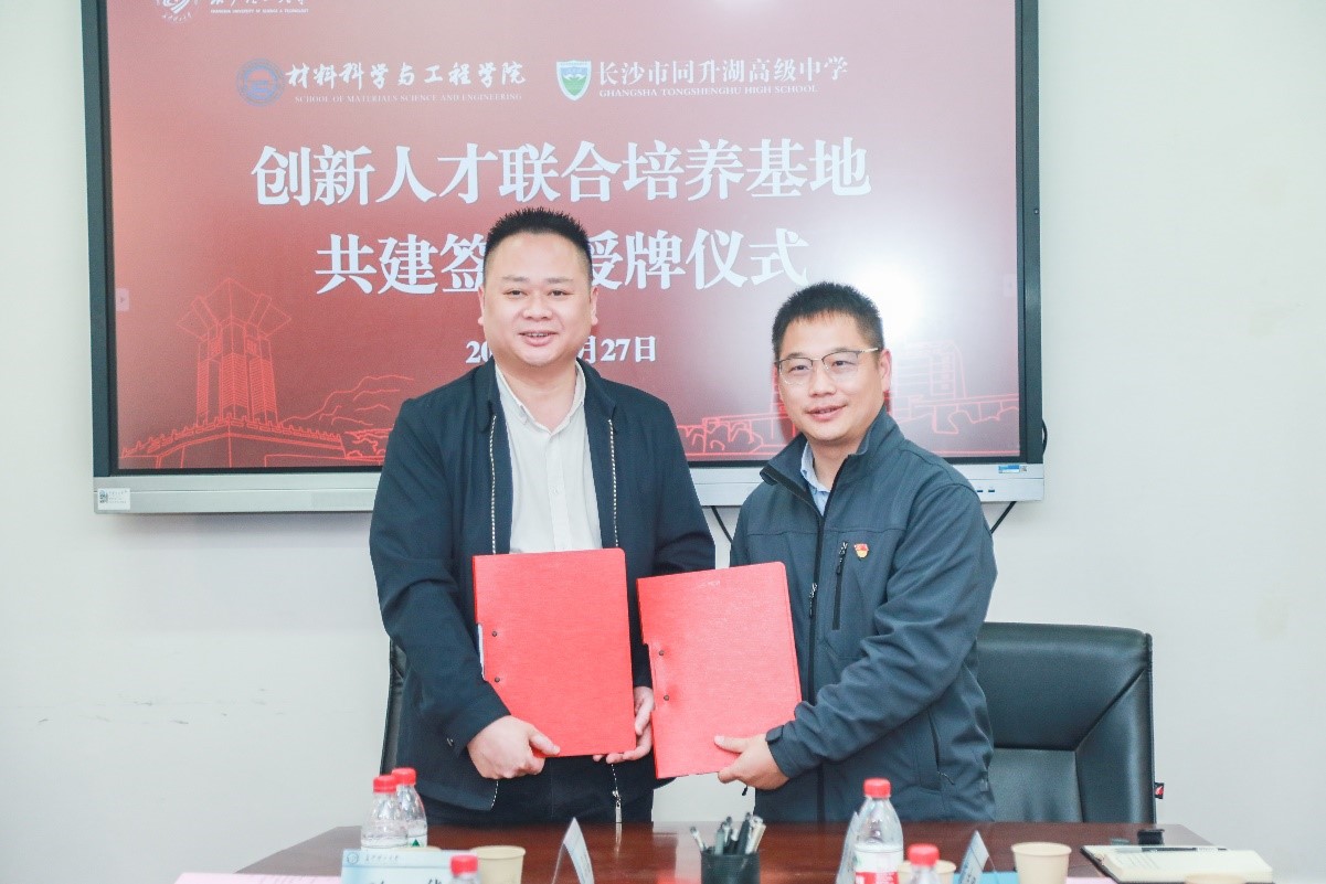 随后,毛卫国、向赞勋代表双方签署“创新人才联合培养基地”共建协议。毛卫国代表长沙理工大学材料科学与工程学院向长沙市同升湖高级中学授牌。双方就加强人才培养输送、深化重点学科教学合作、合力共建创新实践平台等方面进行了深入交流,进一步达成了合作共识。