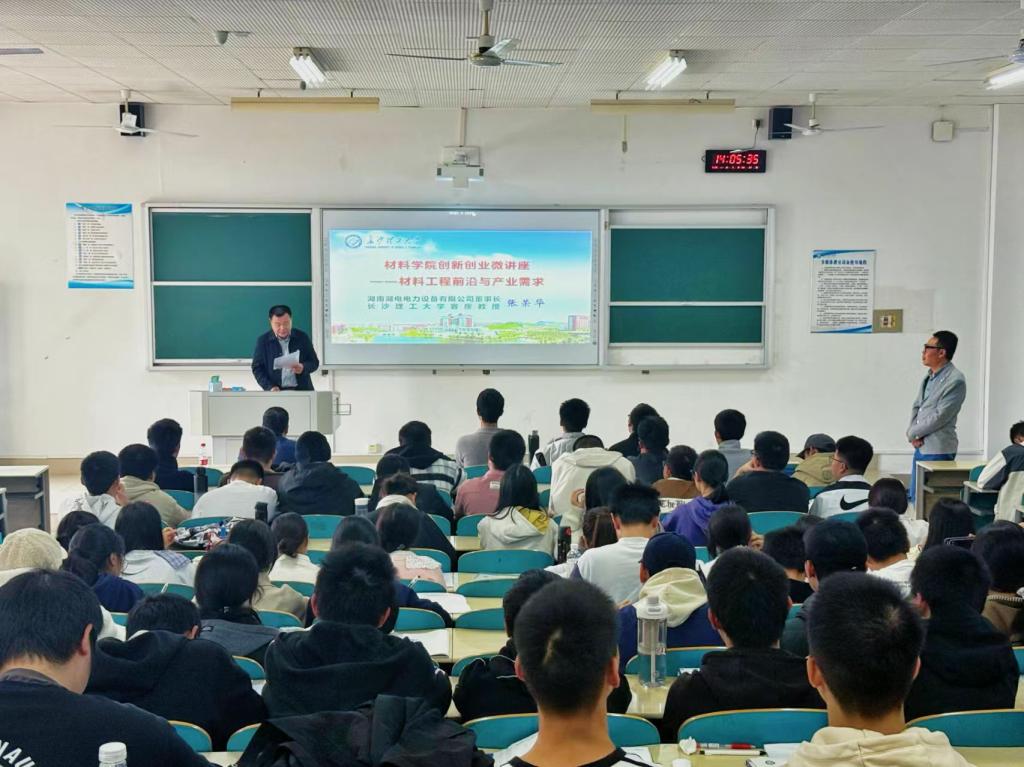 11月12日下午,材料、水利、土木学院在综合教学楼A404联合举办“学科前沿与产业需求”主题创新创业微讲座。首场讲座特邀湖南湖电电力设备有限公司董事长张荣华先生主讲,为全体学生带来一场充满思想启迪与精神感召的精彩分享。
