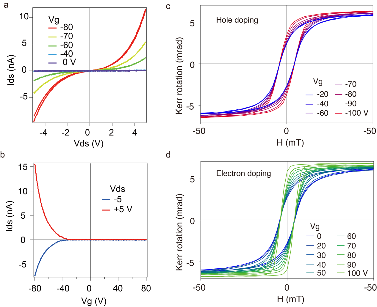 团队采用惰性气氛下原子层厚度的垂直组装,将3.5nm厚Cr2Ge2Te6少数层材料封装于两层氮化硼之中,通过微纳米加工手段制备得到场效应器件,并进行系统的低温电学与磁学测量。电输运测量表明,少数层Cr2Ge2Te6在铁磁居里温度(~65K)以下,保持了载流子导通性,并且能够实现电子与空穴的双极场效应。室温下源漏1V电压得到最大开态电流达数十微安,开关比达到104以上。居里温度以下的低温微区磁光Kerr测量表明,该型纳米器件在门电压调控下,磁性亦能得到有效调控,并且与电输运相仿,存在双极门电压可调特性。证实了基于二维范德华铁磁半导体的自旋场效应器件的可行性。