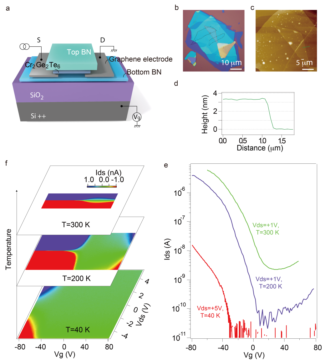 图1.少数层Cr2Ge2Te6范德华异质结器件的制备及其电荷载流子的场效应曲线。
