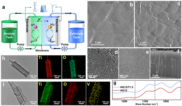 图1 钒电池示意图、TiO2纳米管和Nafion/TiO2纳米管复合膜形貌与结构