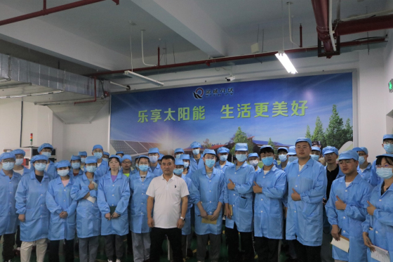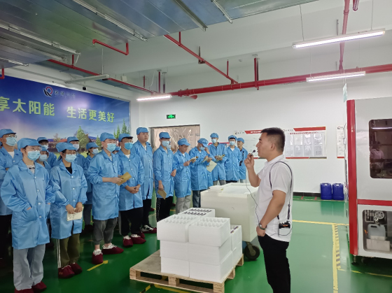 生产主管付志强随后在大会议室向学生们介绍了光伏组件生产流程、太阳能组件封装结构图、单多晶电池片原材料、太阳电池组装工艺简介,更加详细地讲解了串焊、叠层、翻转检、削边、装框、粘接接线盒、组件测试、高压测试等工艺的作用。