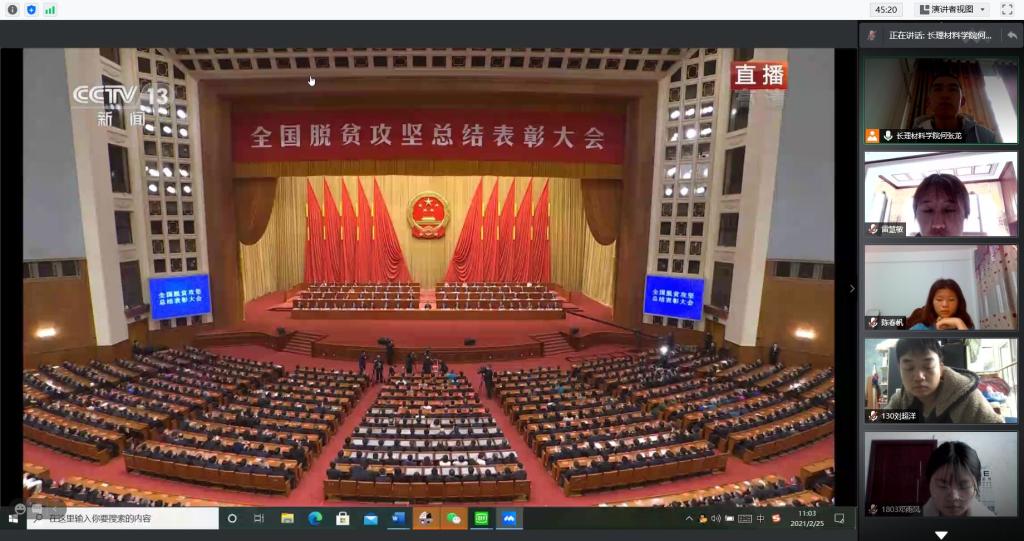 2月25日10:30,全国脱贫攻坚总结表彰大会在北京人民大会堂隆重举行,材料学院学生党支部通过腾讯会议组织进行线上集中观看,研、本全体学生党员收看直播。