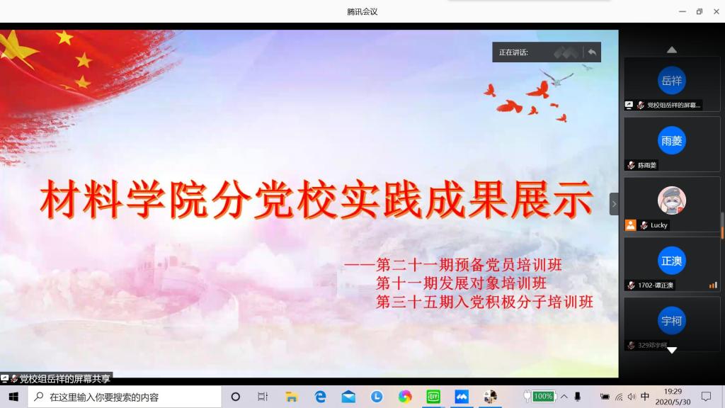 5月30日晚,材料学院依托腾讯会议开展了以“践行抗疫精神、助力伟大复兴”为主题的党校培训班实践成果展。材料学院第21期预备党员、第11期发展对象和第35期入党积极分子培训班的全体学员参加会议,会议由党校组成员崔宁一主持。