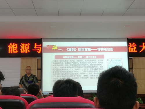 邓豫书记为发展对象讲授的第二课题目为《关于新形势下党内政治生活的若干准则》。他从制定背景、特点分析、具体条款三个方面展开叙述。首先,他从1980年党的十一届五中全会通过的《关于党内政治生活的若干准则》到2016年党的十八届六中全会通过的《准则》,说明了为什么要制定最新准则。接下来他分析了新的准则的重点是新形势下加强和规范党内政治生活。重点是各级领导机关和领导干部;具有以党章为根本、坚持问题导向、继承与创新的有机统一等特点。最后,他从新的准则的目录出发,逐条对每一部分的内容进行了详细的介绍,并与之前准则的内容进行对比,更加突出了新的准则的先进性和科学性。