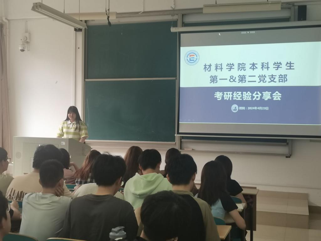 4月23日下午,材料科学与工程学院本科学生党支部于工科三号楼B211开展“理想启航,研梦飞扬”主题党日活动分享考研学习经验。本次活动由本科一支部和二支部联合举办,共60余名低年级党员和入党积极分子参加。党员何艺璇主持了本次活动。