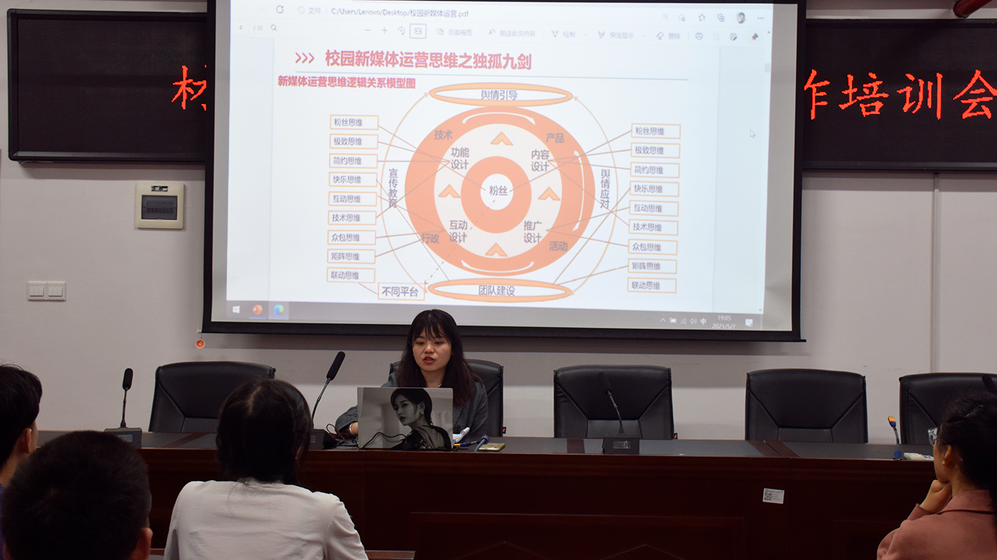 会议伊始,曹婷从新媒体的九种运营思维、十八种运营技巧及如何做好一篇推送三个方面,点面结合,生动形象的阐述了校园新媒体运营的知识。随后,她结合自己运行公众号的经历,提出了以下几点建议:一要考虑受众是谁,以用户为核心;其次要严谨认真,不发布自己不满意的产品;二要遵守简约规则,标题、内容、活动规则要书写简约,做到看起来简洁,用起来简化,说起来简单;三要有自己的风格,多跟用户互动,多在用户角度考虑;四要多部门、平台一起联动,各取所需,发挥矩阵作用。最后,院团委副书记刘湉湉和新媒体中心负责人金鑫结合学院新媒体发展存在的问题进行提问,曹婷给出了先找准平台的定位、定好方向等建议。