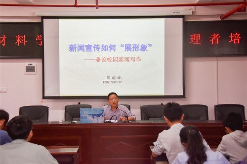 5月18日,材料学院于新能源1号楼开展了第三期卓越管理者培训班第四课---新闻宣传专题培训,此次主讲人为长沙理工大学党委宣传部副部长邓崛峰,团学会全体成员参加培训会。