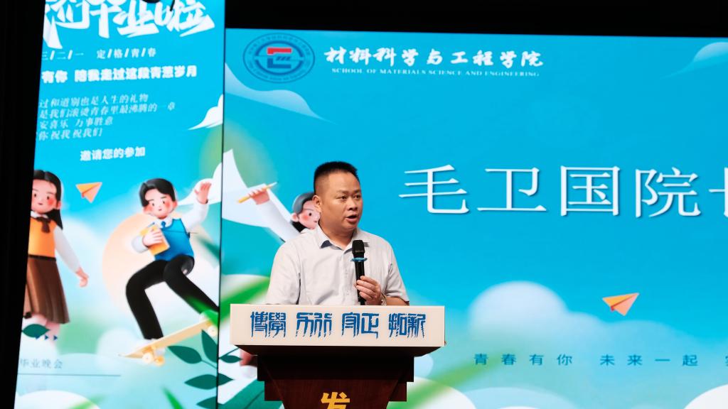 中场时段,材料学院院长毛卫国教授在致辞中向即将踏上新征程的毕业生寄予了殷切的期望。他希望,毕业生们要乘风破浪,持续前行,坚持终身学习、主动思考,在实践历练中迅速成长;要紧跟时代,常怀感恩,树立远大的理想,感悟时代脉搏,主动投身社会,担当职责;要勇于创新,开拓未来,用青春、智慧谱写好奉献祖国、服务社会的人生之歌。”接下来,毛卫国为毕业生代表授旗并宣布长沙理工大学材料科学与工程学院2024届校友会材料分会正式成立。