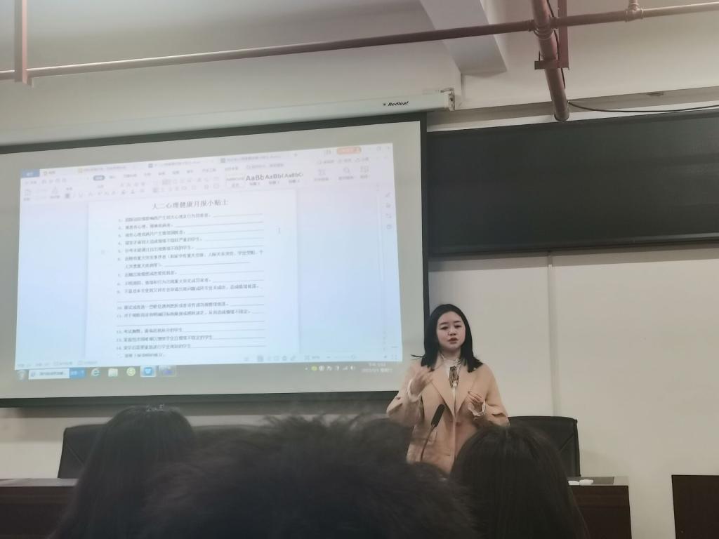 大二年级朋辈心理互助员重新指定由每个寝室的班委骨干担任,谢易真明确了寝室朋辈心理互助员的职责,希望大家配合好班级心理委员与生活委员完成寝室同学心理状况周报、日常晚归寝反馈等工作,相互形成联动,共同守好大二年级安全底线。随后,谢易真针对大二年级可能面临的专业分流、校区环境适应、学业人际适应等问题进行详细的分析,并就相关问题朋辈心理互助员应当如何进行反馈和实施帮助进行培训。最后,谢易真对如何有效识别正常和异常情绪状态进行培训,并就近期的周报和月报工作进行详细的布置,再次强调寝室朋辈心理互助员要落实自己的工作,对同学出现异常情况需及时反馈。