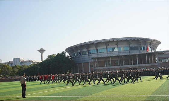 2019级新生进行军训成果汇报表演。军体拳、擒敌拳、匕首操、战术演练方队依次上场,他们行动一致,出拳虎虎生威,踢腿凌厉有力,演练斗志昂扬,势如霹雳。他们是一道亮丽的风景,也是一弯燃烧的霓虹。由各系新生组成的军训方队依次走过主席台,他们步伐矫健、英姿飒爽,全面展示了2019级新生蓬勃向上的精神风貌。