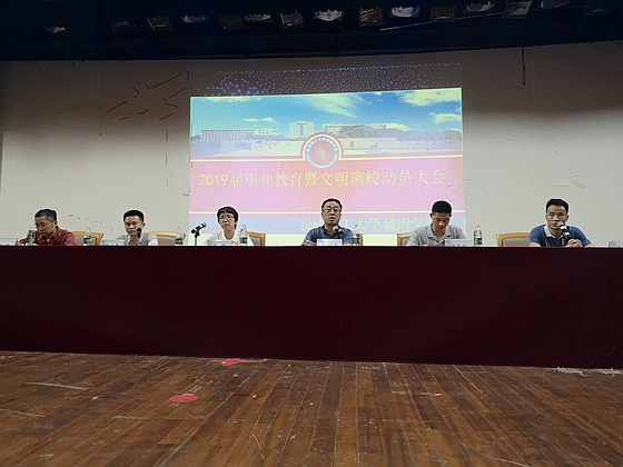 为了加强2019届毕业生教育管理,全面做好毕业生文明离校各项工作,6月13日晚,城南学院在五教大礼堂分两场召开了2019届毕业生教育暨文明离校动员大会。院党委副书记王明彦、教学部主任李娟、招就中心主任蔡湘粤、各系学工办主任、毕业班辅导员以及全体2019届毕业生参加会议,大会由院学工部部长肖义慧主持。