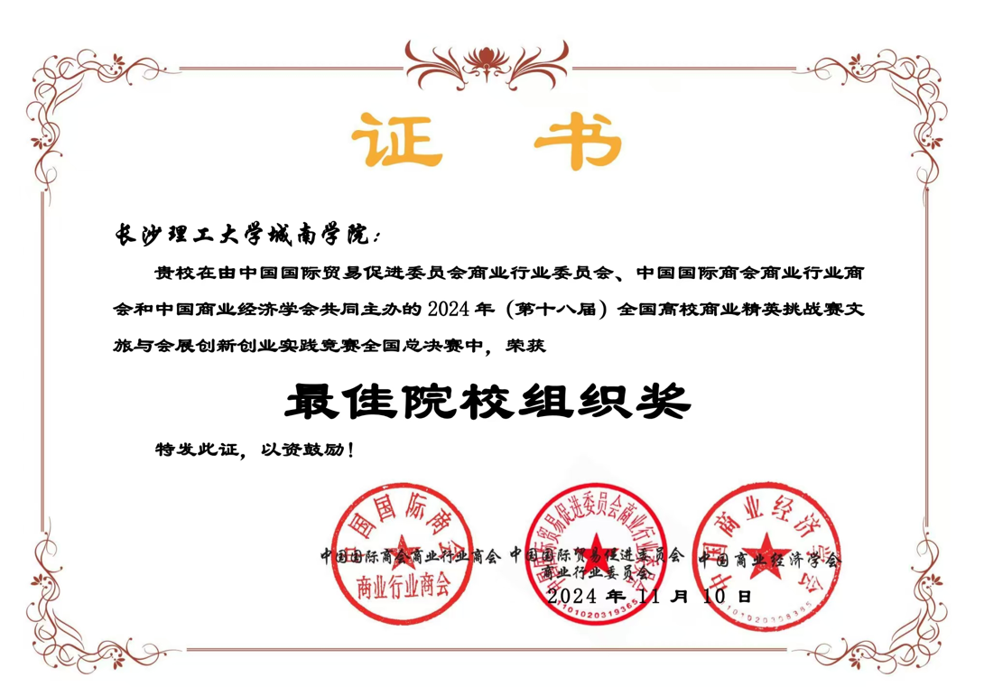 近日,由中国国际贸易促进委员会商业行业委员会、中国国际商会商业行业商会以及中国商业经济学会联合主办的 2024 年(第十八届)全国高校商业精英挑战赛文旅与会员创新创业实践竞赛全国总决赛完美收官。长沙理工大学城南学院在此次大赛中表现卓越,凭借优秀的组织能力和师生团队的精彩发挥,成功斩获 “最佳院校组织奖”,有力彰显了学院在创新创业教育板块的斐然成果。