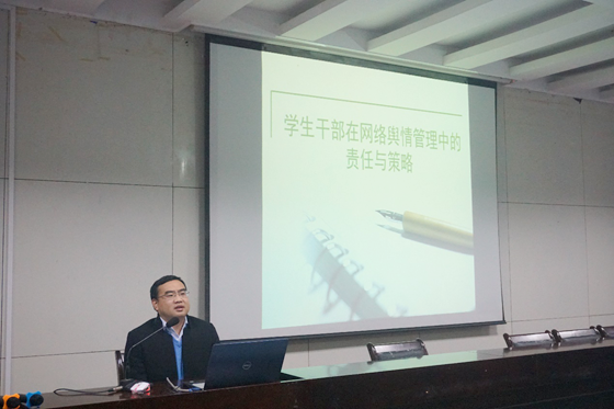 成华为青马班讲授第一课。他以“学生干部在网络舆情管理中的责任与策略”为题,阐述了当前国际政治与经济发展形势以及我们国家在当今世界格局中的地位,从当前网络舆情的总体研判分析入手,指出学生干部在网络舆情管理中有什么样的责任,在自己能力、角色范围内要怎样开展工作。他强调,必须坚持马克思主义在意识形态领域的指导地位,自觉用马克思主义这一思想武器武装我们的头脑;学生骨干在同学中要发挥好网络舆情的正面引导作用,强化网络安全和诚信自律意识,通过正常渠道表达合理诉求,从根源上杜绝谣言的发起和炸弹般的传播;要用正确的态度对待自媒体,坚持营造风清气正的网络空间,讲好身边的好故事,传播校园好声音,弘扬校园正能量。