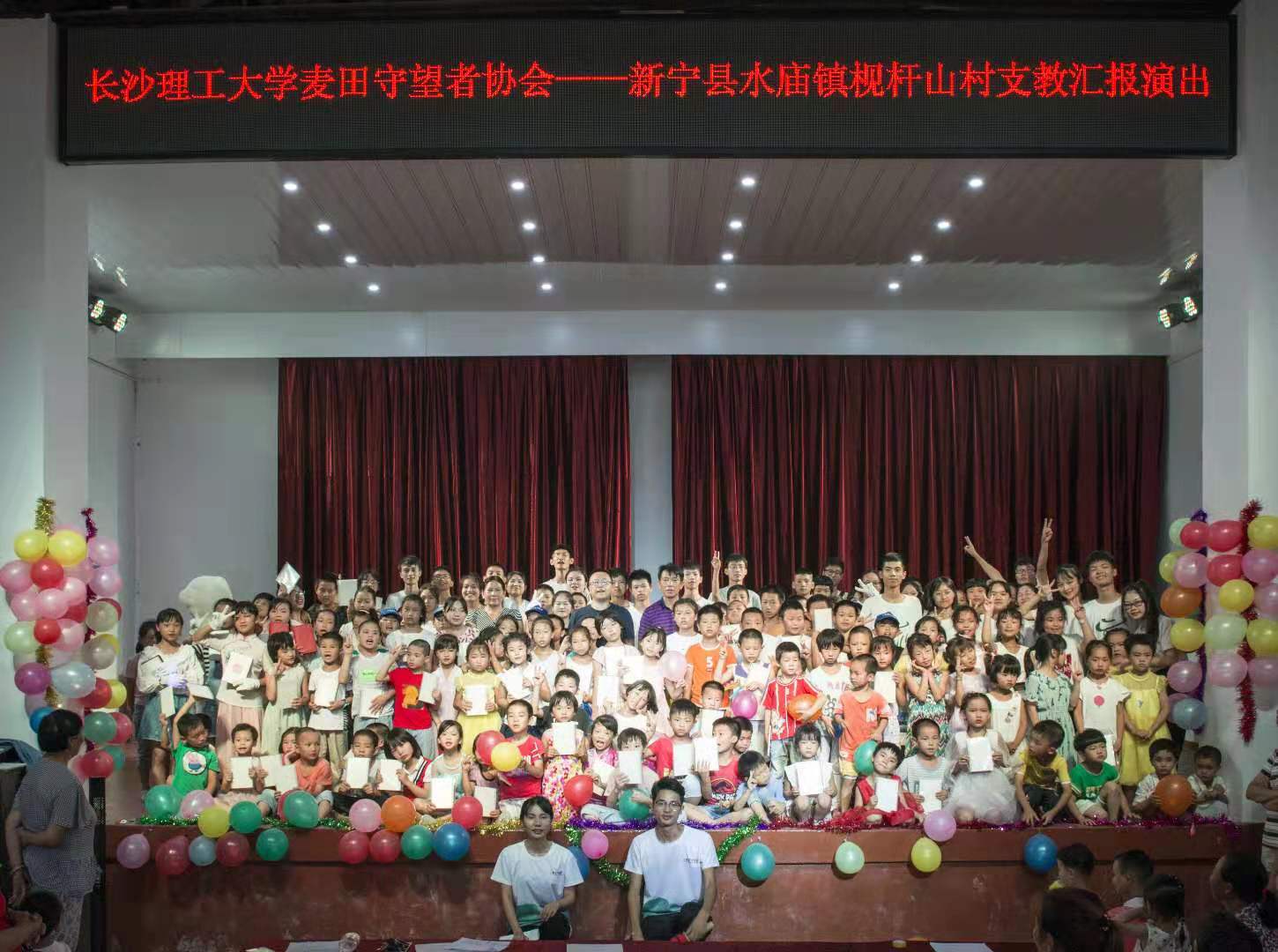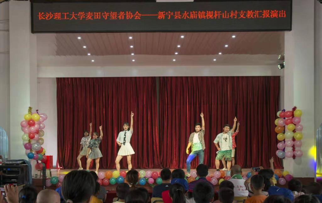 7月29日,长沙理工大学城南学院麦田支教队为雷竞技官网扶贫点——新宁县水庙镇枧杆山村一百三十余名留守儿童举行“汇报演出”。长沙理工大学驻村扶贫工作队队长、村第一书记宋刘斌,村支书杨忠祥,村主任龙艳洲,驻村扶贫工作队成员以及村两委干部等嘉宾受邀参加此次活动。