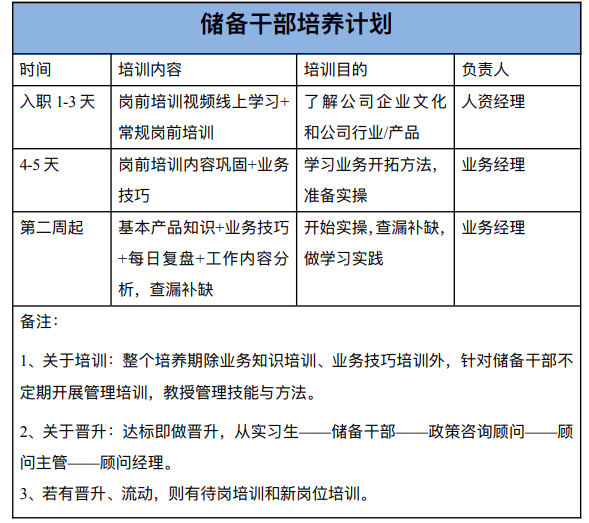 4. 岗位概述 根据公司⼈才培养计划,从学习公司基础业务知识开始,逐步从储备⼲部— —政策咨询顾问——顾问主管——顾问经理。