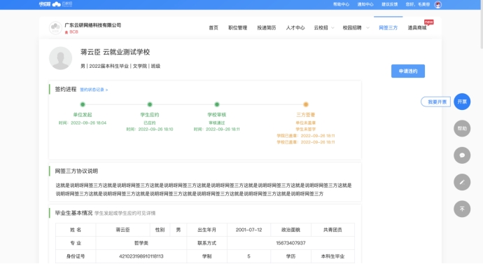 b)【搜索学校】-【输入学号或姓名】查找学生,点击【发起网签】并完善三方协议信息,学生即可接受到单位三方邀约信息;