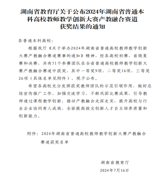 近日,湖南省教育厅公布了2024年湖南省普通本科高校教师教学创新大赛产教融合赛道获奖名单,我院孙亚贤老师团队经高校初赛、省级复赛和决赛荣获省级三等奖。本次获奖是我院省级教学竞赛奖项的又一次突破,充分体现了我院教师的教学水平和教学创新能力。