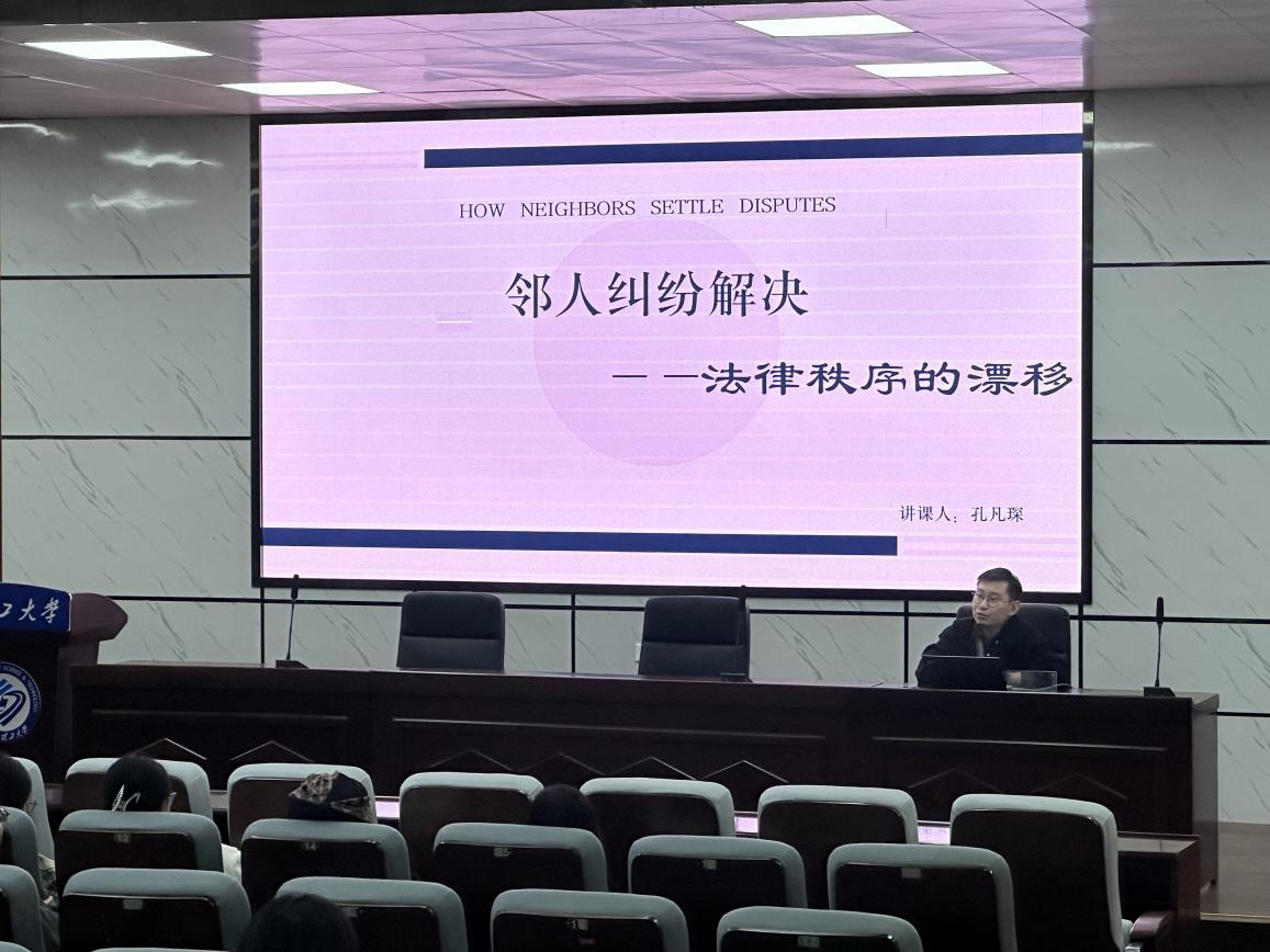 11月14日晚,长沙理工大学法学院硕士研究生导师、湖南省诉讼法学研究会理事孔凡琛,在金盆岭校区作题为“邻人纠纷解决:法律秩序的漂移”的通识教育学术讲座。本次讲座主要围绕邻人间的纠纷是如何产生的,以及邻人纠纷背后的深层利益冲突,我们如何借助多元化纠纷解决理念和民事诉讼争端解决机制原理处理好身边的邻人纠纷展开。讲座吸引了全校法学爱好者100余人参加。