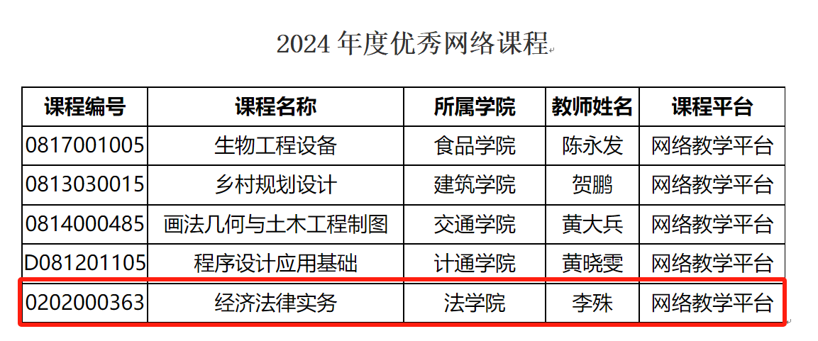 近日,雷竞技官网公布了2024年度优秀网络课程获奖名单,法学院李殊老师的《经济法律实务》被评选为长沙理工大学2024年度优秀网络课程。这一荣誉的获得,不仅是对李殊老师教学质量的高度认可,也展示了法学院在推进教学模式创新、提升教育质量方面的卓越成效。