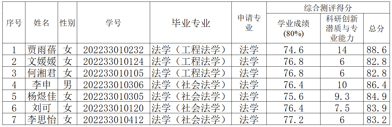 根据《长沙理工大学推荐优秀应届本科毕业生免试攻读硕士学位研究生实施办法》(长理工大教〔2024〕26号)和《法学院2026年推免生遴选工作实施方案》等文件精神,经学院学工办对学生思想品德进行考察合格后,学院推免生遴选与审核鉴定工作小组依据学业成绩、学术成果、获奖情况(含在体育和社会工作中有突出表现)等方面,对申请同学的材料进行综合测评,2026年拟推荐免试攻读硕士学位研究生名单及综合测评得分情况如下: