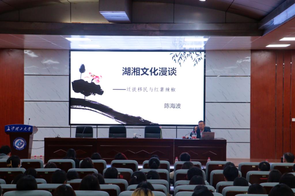 为拓展学生视野,提升学生培养质量,3月9日,长沙理工大学研究生云影讲坛在金盆岭四教学术报告厅如期举行。本次讲座由长沙理工大学法学院承办,以“湖湘文化漫谈——迁徙移民与红薯辣椒”为主题,由湖南省人民检察院原副厅级干部、省检察官文联主席陈海波主讲,并邀请文学与新闻传播学院副院长周云鹏担任讲座主持人,200余名本科生和研究生代表到场聆听。