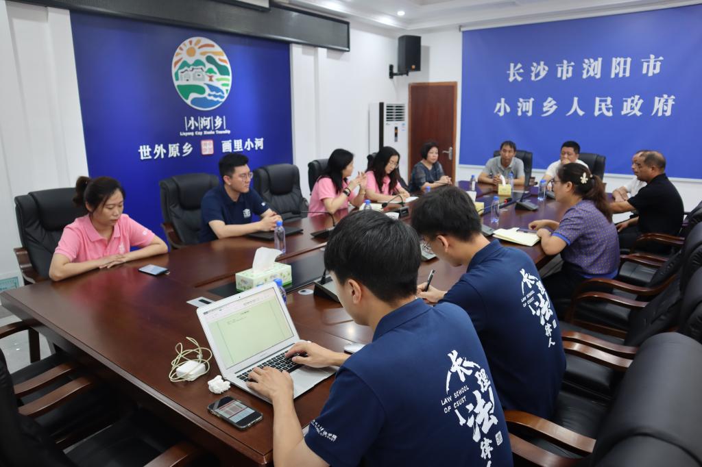 当天上午,实践团在浏阳市小河乡人民政府三楼会议室召开了关于乡村振兴与野生动物致害补偿的座谈会,小河乡副乡长兼宣传委员刘婷远,周宏副主任以及两位村民代表出席了本次座谈会。副乡长刘婷远向实践团成员简单介绍了小河乡的历史渊源、人口分布、生态环境等基本情况,围绕小河村农民画室、乡村旅游、特色农业和烟花制作等四大产业向实践团成员分享乡村振兴的实践经验。实践团还就村民在土地流转、婚姻家事、劳动合同、禁毒反诈、未成年人教育与保护等方面的法治需求征询与会代表意见,并对清单制定点普法服务与乡政府达成了基本共识。