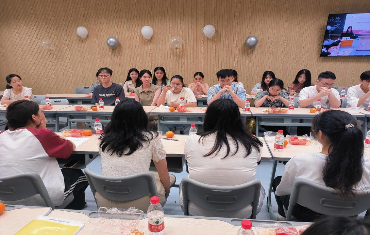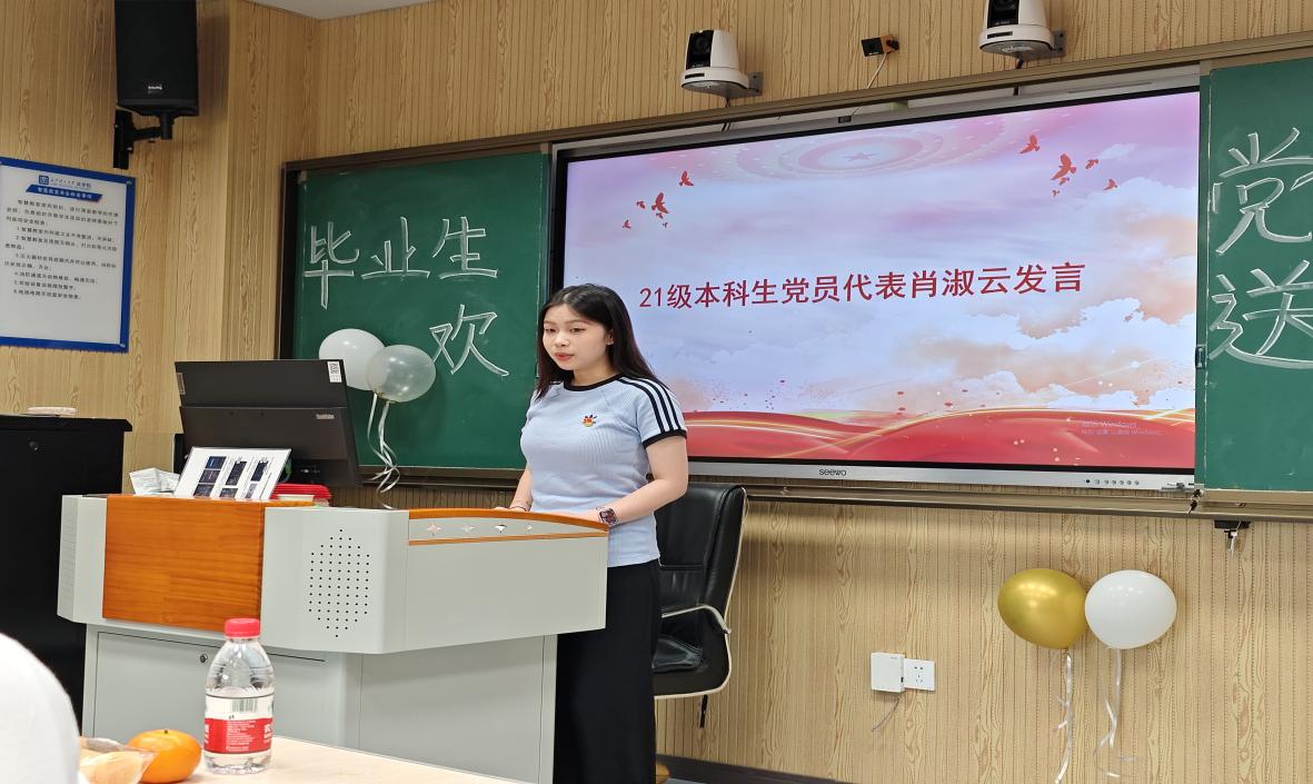 “凤箫声动,玉转光壶,离别恍然而至。”21级本科生党员肖淑云在发言中以诗意的语言描绘了与毕业生党员们共度的美好时光,表达了对他们的敬意和不舍之情。同时,她代表低年级学生党员祝愿毕业生党员们前程似锦,一路鲜花盛放。