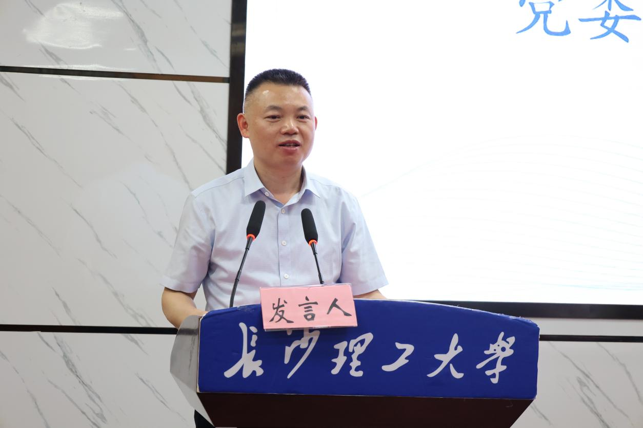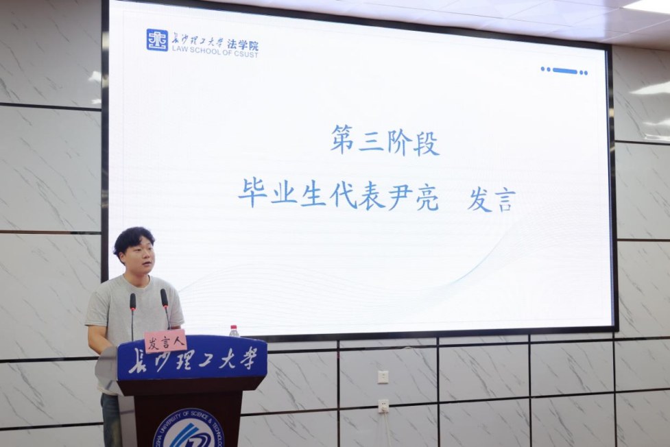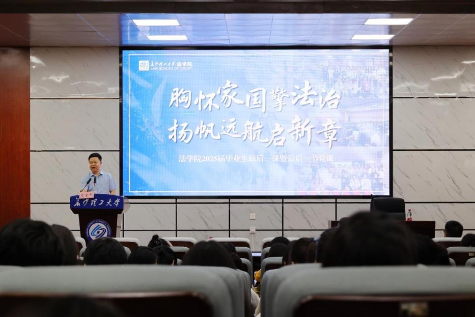 龚文斌为全体毕业生讲授了最后一堂党课。他首先为毕业生取得的优异成绩点赞,随后提出三点希望:一要胸怀家国情怀,铸造法治脊梁;二要坚持终身学习,紧跟时代潮流;三要涵养“清风之德”,保持廉洁自律。他勉励所有毕业生,在变革的时代要守住初心,在建设祖国的征程中绽放青春芳华。最后,他暖心寄语即将毕业的学子:“无论未来的路途如何漫长遥远,长沙理工大学法学院始终是你们坚实的依靠和后盾。我们热切期盼你们常回家看看。”