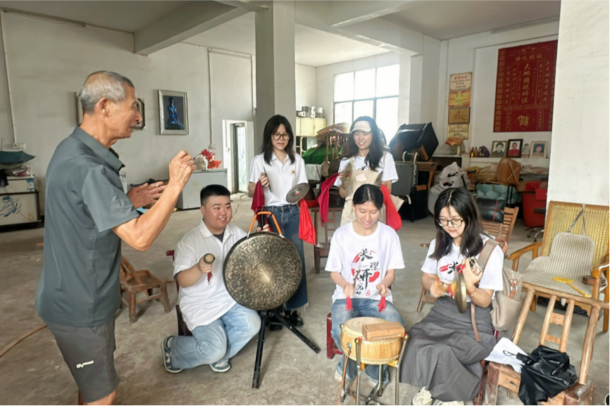 实践团队首站抵达桑植民歌寨非遗传承基地,在工作人员引导下参观特色稻田与民歌文化展区。通过聆听讲解,团队深入了解了桑植民歌的历史渊源、艺术特色及传承价值,为后续研究奠定认知基础。23日,团队赴瑞塔铺镇拜访桑植围鼓市级传承人彭辉峪、桑植花灯省级传承人满元恒及市级传承人李晓香。在彭辉峪家中,团队观察到其堂屋陈列的乐器与荣誉证书,直观感受到非遗传承的厚重积淀;满元恒与李晓香则通过几十年坚守桑植花灯的动人故事,诠释了非遗传承人的文化使命。团队还参与围鼓演奏体验,深化了对非遗技艺感染力的理解。24日,团队奔赴马合口白族乡麦地坪村,拜访了桑植白族仗鼓舞国家级非遗传承人钟必武及其徒弟——市级传承人钟彩香、钟新化,县级传承人刘银年,以及桑植白族游神市级非遗传承人钟高仁。钟必武先生的传承事迹践行了“义务传承、喜爱传承、奉献传承”精神,老先生希望特色文化能得到更广泛传播, 呼吁更多年轻人参与传承