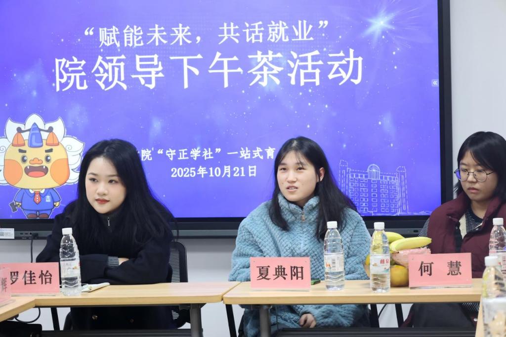 10月21日下午,长沙理工大学法学院“守正学社”一站式育人社区内茶香四溢,气氛温馨融洽。一场以“赋能未来,共话就业”为主题的院领导下午茶活动在此举行。学院学术院长吴勇、党委副书记汪伦、涉外法治系系主任王寰、法学系教师党支部书记胡俊、就业专干兰贵辉老师与16名2026届本科、研究生毕业生代表围坐一堂,聚焦法学学子面临的考研深造“攻坚战”与求职择业的“选择题”,进行了深入、坦诚、温馨地交流与探讨。