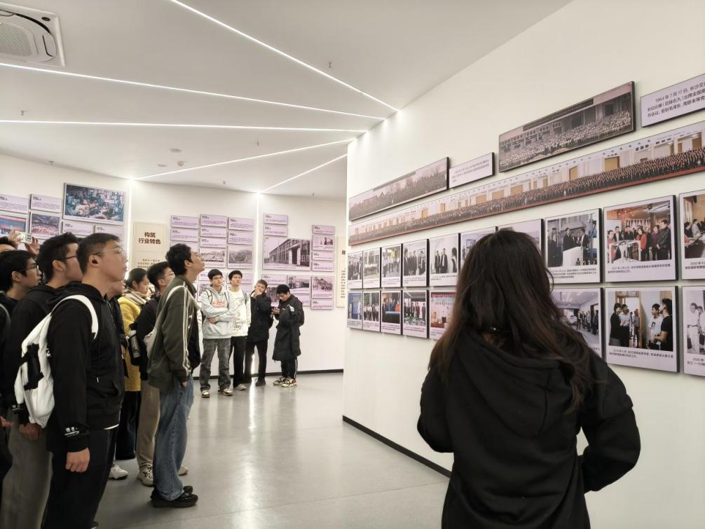 学生们首先走进“国之大者”“材之茂者”篇章,展区内呈现的校史脉络与时代实践深度融合。从学校建校初期的发展历程,到参与“抗震救灾”“抗冰复电”等应急抢险工作,再到港珠澳大桥、矮寨大桥等重大工程建设场景的展示,生动再现了学校服务国家战略的奋斗足迹。
