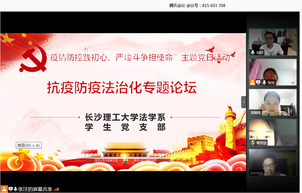 “在全国人民众志成城抗击疫情之际,却有不法分子利用疫情实施诈骗,消耗社会爱心,影响疫情防控和社会治安稳定,应受法律惩处”,5月19日,长沙理工大学法学系学生党支部举行的“初心论坛”中,法学系学生党员阳青杉在专题分享中分析了妨害新冠肺炎疫情防控犯罪典型案例。此次法学系首期党员“初心论坛”聚焦抗疫防疫法治化,党员们用专业知识让党旗飘扬在依法抗疫前线。法学系党总支副书记田兴洪、关工委副主任高纯一以及全体辅导员参与论坛。