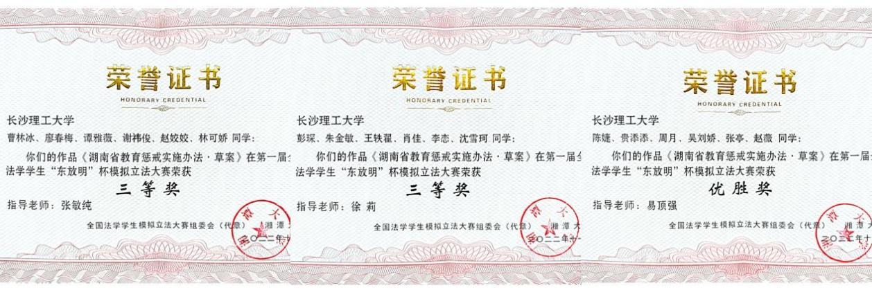 我院在本次大赛中取得优异成绩,得益于我院坚持以“产教融合”理念为指引,贯彻“四位一体”的育人机制。今年来,法学院依托长沙理工大学地方立法研究中心开展了《湖南省茶产业发展促进条例(草案)》、《湖南省气象灾害防御条例(草案)》、《湖南省水资源管理条例(草案)》等多项立法起草服务项目,其中《湖南省茶产业发展促进条例》已于2022年9月26日经湖南省第十三届人民代表大会常务委员会第三十三次会议通过,参与本次大赛获奖的同学也大多参加过立法起草相关工作,具有丰富的地方立法实践经验。同时,法学院一直积极组织开展法律文书写作比赛、研究生法律案例大赛等各种学科竞赛,激发学生学习兴趣,培养学生创新思维、团队合作以及解决实际问题的能力,鼓励支持学生参与校内外各类法学竞赛,打造知识、能力、素质协调发展的创新型人才,并坚持以学科竞赛为引领,推动研究性教育教学改革。此次参赛有助于提高学生的知识应用能力、实践创新能力、沟通和团队协作能力,这对于学生未来的发展,无论是学术研究方面还是工作处事方面,都是一个很好的锻炼机会,也是学院全面培养具有创新精神和实践能力的高素质创新型法治人才的体现。