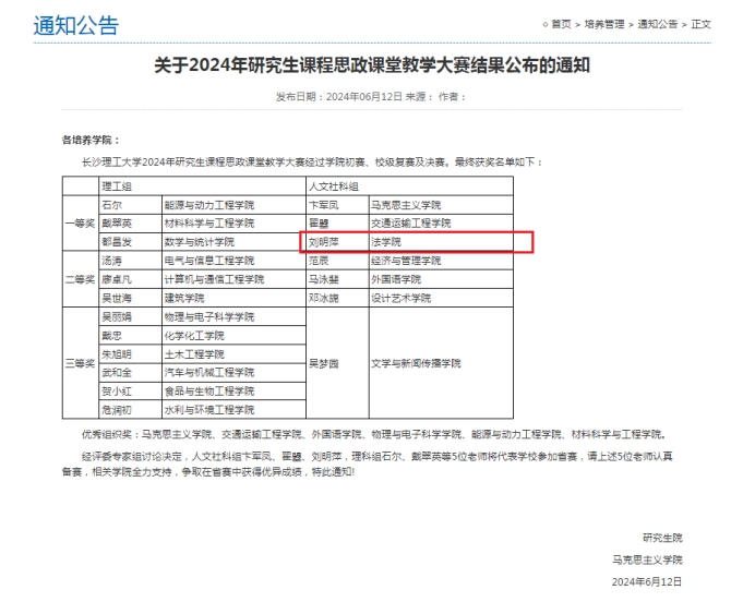 为全面推进研究生课程思政建设,更好服务“三高四新”战略任务。学校决定举办第二届长沙理工大学研究生课程思政课堂教学大赛暨第二届湖南省研究生课程思政课堂教学大赛校内选拔赛。我院积极组织教师参加2024年长沙理工大学课程思政教学竞赛。